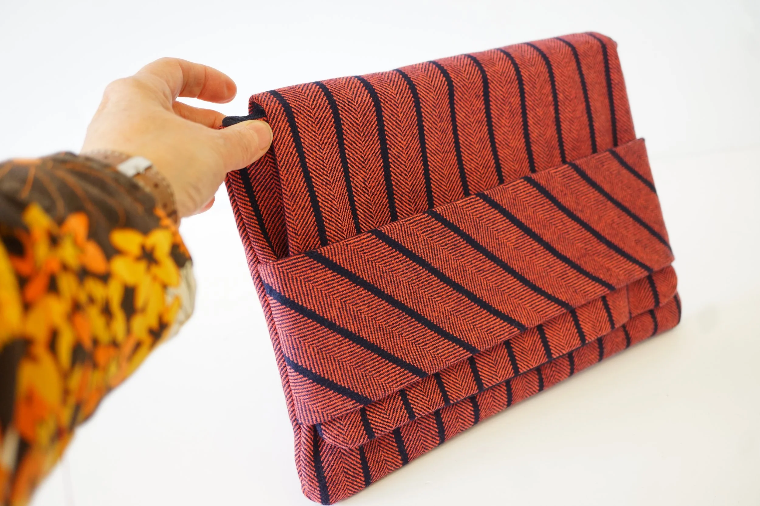 Make a statement with this beautifully crafted large clutch bag, featuring a striking striped herringbone tweed in soft blush pink with deep blue accents. The bold geometric design is enhanced by a large flap that tucks seamlessly into the front panel, cut on the bias for a dynamic look.